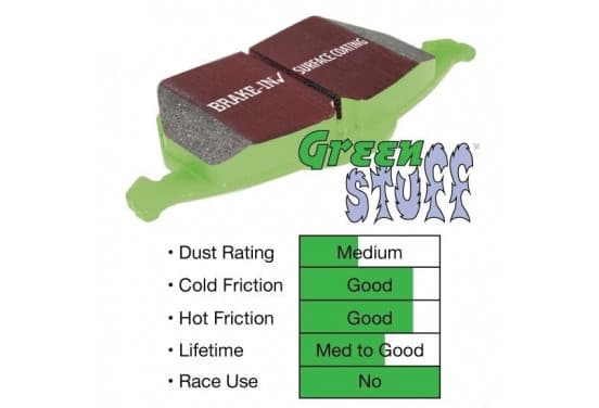 Les plaquettes de frein EBC Greenstuff conviennent à une utilisation sportive en milieu urbain. Ces cales peuvent être utilisées en remplacement des plaquettes de frein d'origine et constituent une légère amélioration par rapport aux plaquettes de frein «standard»! Les plaquettes de frein produisent moins de poussière de frein et sont résistantes aux températures élevées Les plaquettes de frein Greenstuff conviennent à une utilisation sportive dans les rues des voitures plus légères. Pour les voitures plus lourdes ou les circuits, nous recommandons les plaquettes de frein Redstuff et Yellowstuff. | |